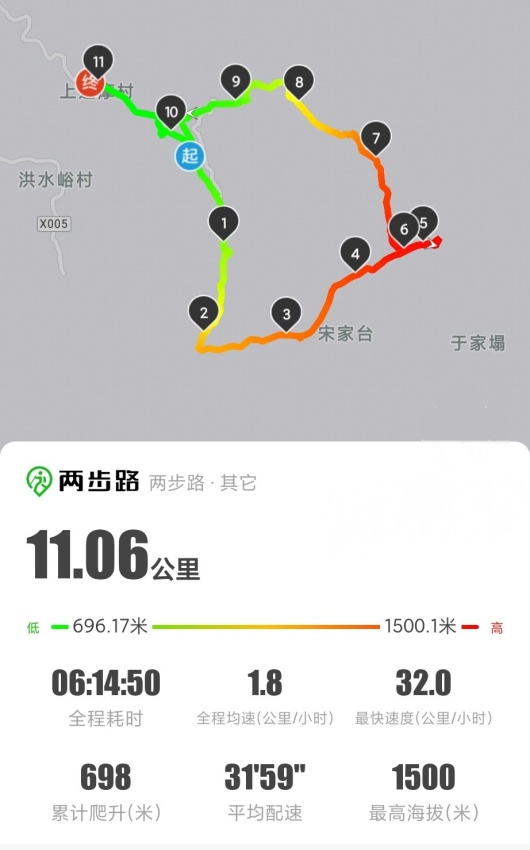 此次徒步路线全程约11公里,最高海拔达1481米,累计爬升807米。